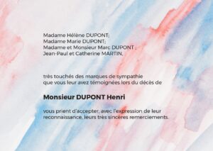 Nos modèles personnalisables de cartes de remerciement à vos proches pour leur soutien après un décès sont adaptés à tous les styles. Nous vous proposons un large choix de décors, couleurs et motifs correspondant à vos préférences, au défunt et à l’hommage que vous souhaitez lui rendre.